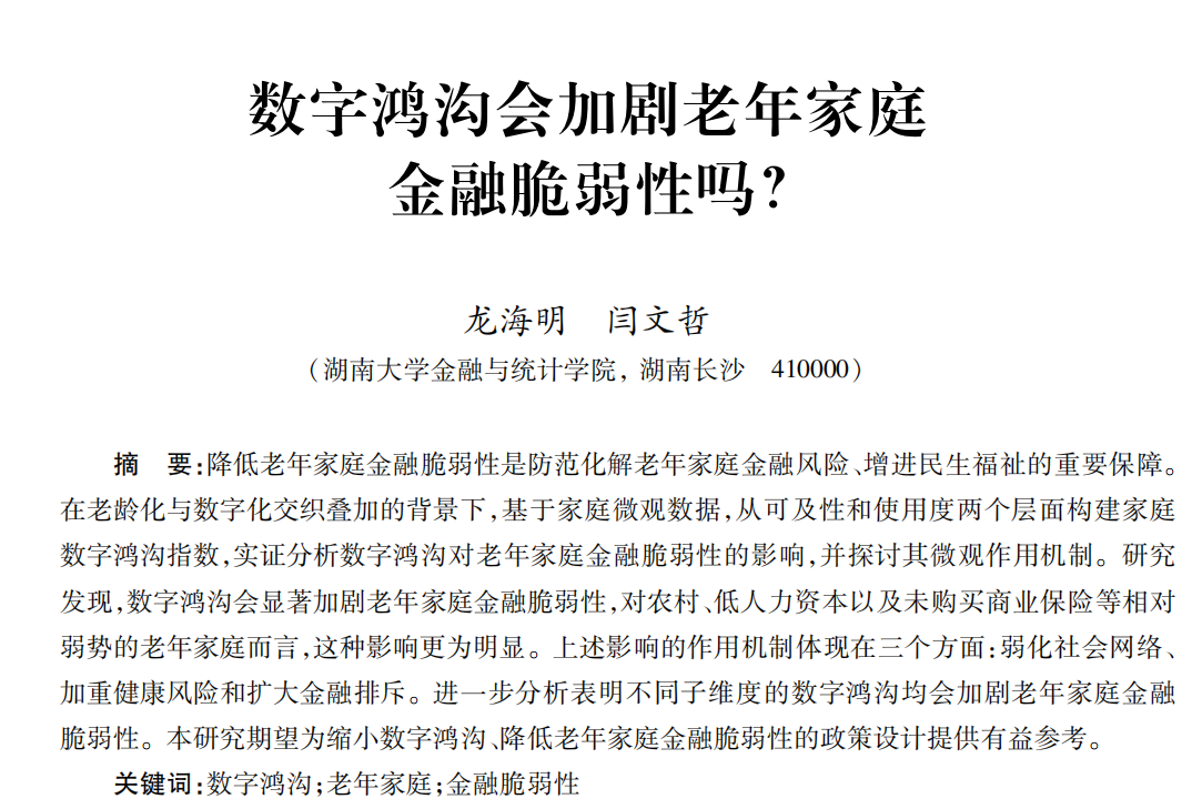 近日,365英国上市公司在线应用金融系龙海明教授和2021级博士研究生闫文哲合作的题为“数字鸿沟会加剧老年家庭金融脆弱性吗?”的论文发表在《金融研究》2024年第11期。