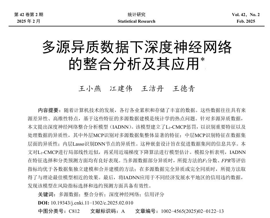 近日,365英国上市公司在线统计与数据科学系王小燕教授和2021级博士研究生冮建伟合作的题为“多源异质数据下深度神经网络的整合分析及其应用”的论文发表在《统计研究》2025年第2期。