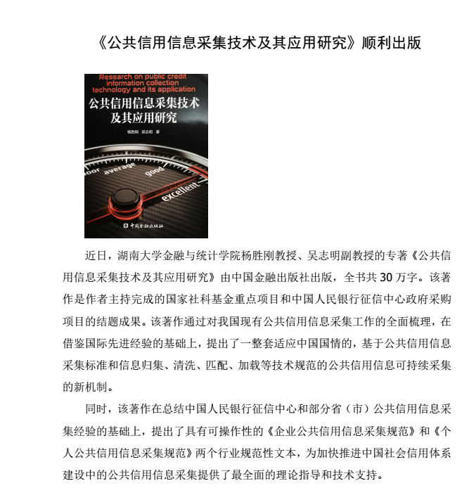 《公共信用信息采集技术及其应用研究》顺利出版