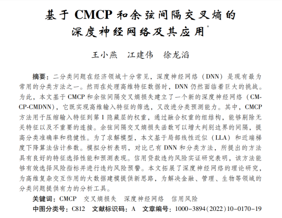近日,365英国上市公司在线统计系王小燕副教授,和2021级博士研究生冮建伟、2021级硕士研究生徐龙滔合作的题为“基于CMCP和余弦间隔交叉熵的深度神经网络及其应用”的论文发表在《数量经济技术经济研究》2022年第10期。