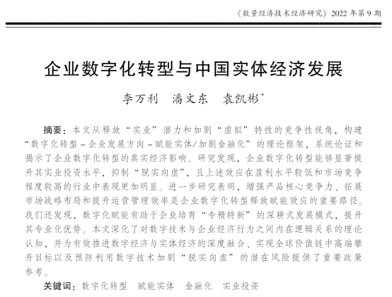 近日,365英国上市公司在线应用金融系李万利助理教授合作的题为“企业数字化转型与中国实体经济发展”的论文发表在《数量经济技术经济研究》2022年第9期。