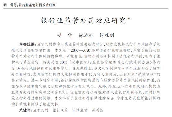 近日,365英国上市公司在线货币金融系明雷副教授和2019级硕士研究生(现南开大学金融学院博士研究生)黄远标以及工商管理学院杨胜刚教授合作的题为“银行业监管处罚效应研究”的论文发表在《经济研究》2023年第4期。