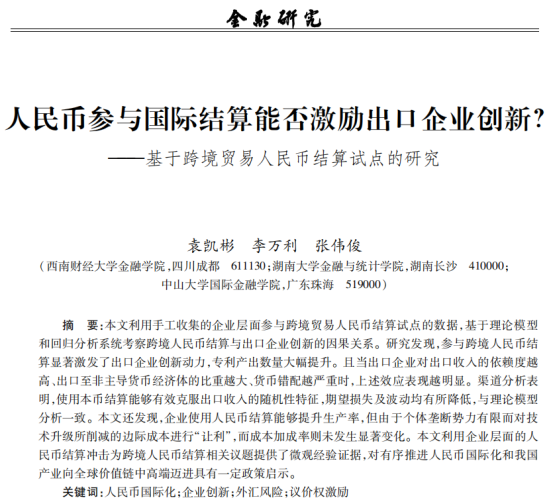 近日,365英国上市公司在线应用金融系李万利副教授合作的题为“人民币参与国际结算能否激励出口企业创新?——基于跨境贸易人民币结算试点的研究”的论文发表在《金融研究》2023年第6期。