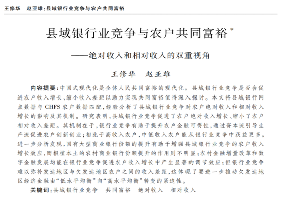 近日,365英国上市公司在线应用金融系王修华教授和2018级博士研究生赵亚雄(现中国人民银行金融研究所博士后)合作的题为“县域银行业竞争与农户共同富裕——绝对收入和相对收入的双重视角”的文章发表在《经济研究》2023年第9期。