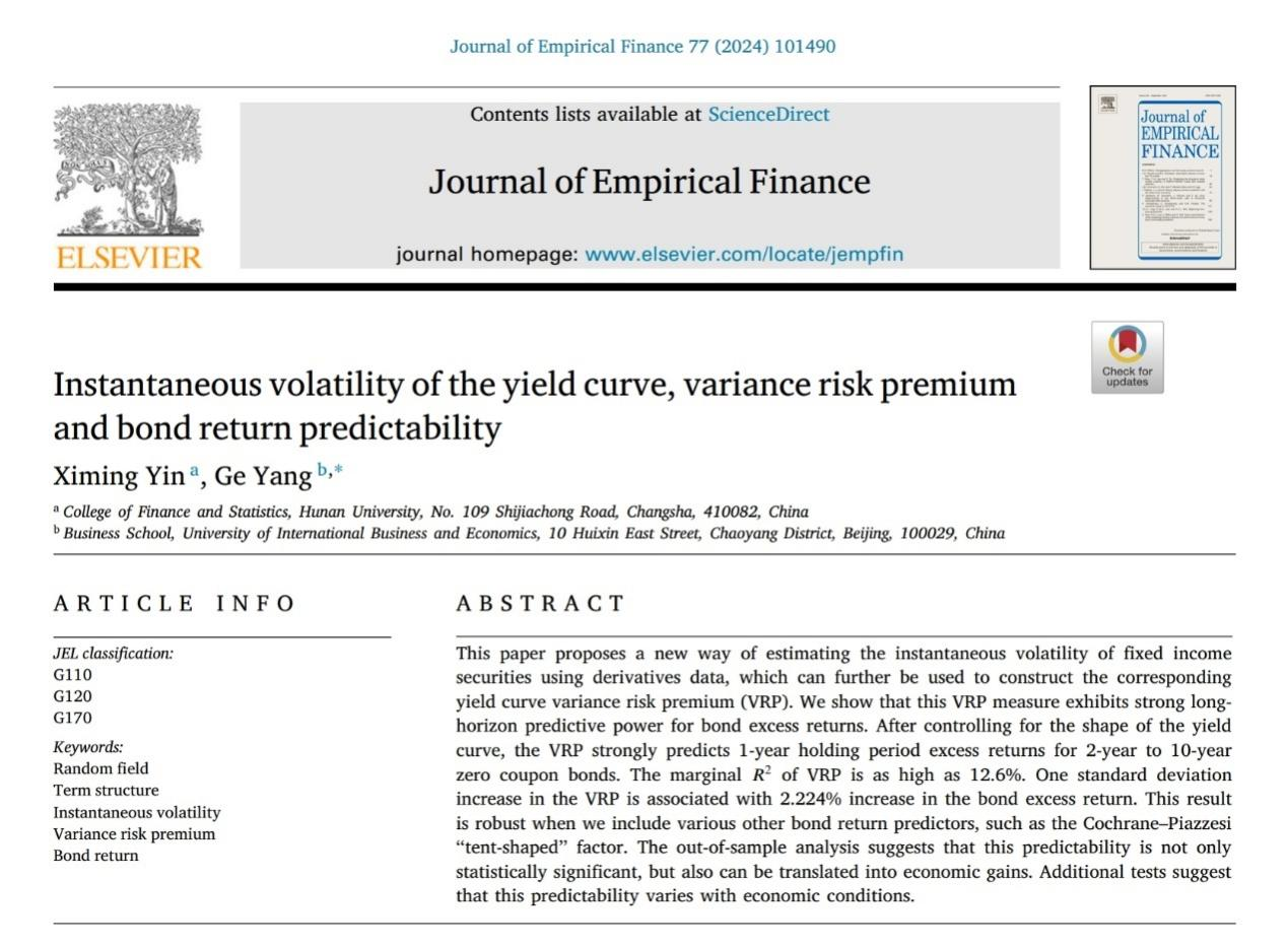 近日,365英国上市公司在线金融工程系助理教授尹希明作为第一作者撰写的论文 “ Instantaneous volatility of the yield curve, variance risk premium and bond return predictability ” 在院定 A 类期刊 Journal of Empirical Finance,Volume 77, June 2024 发表。