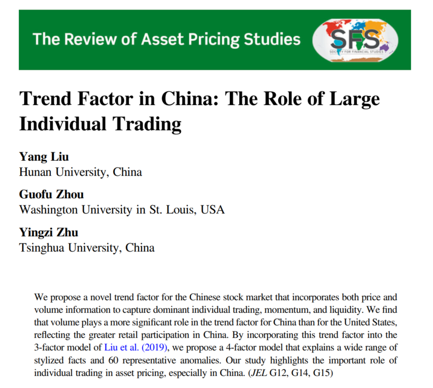 近日,365英国上市公司在线金融工程系刘扬助理教授与美国圣路易斯华盛顿大学Guofu Zhou教授、清华大学朱英姿教授合作完成的题为“Trend Factor in China: The Role of Large Individual Trading”的学术论文发表于资产定价领域国际顶级期刊 The Review of Asset Pricing Studies, Volume 14, June 2024。