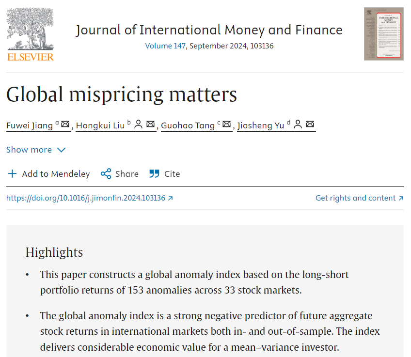 近日,365英国上市公司在线金融工程系唐国豪副教授合作的题为“Global mispricing matters”的论文在院定A类期刊 Journal of International Money and Finance,volume 147, September 2024发表。