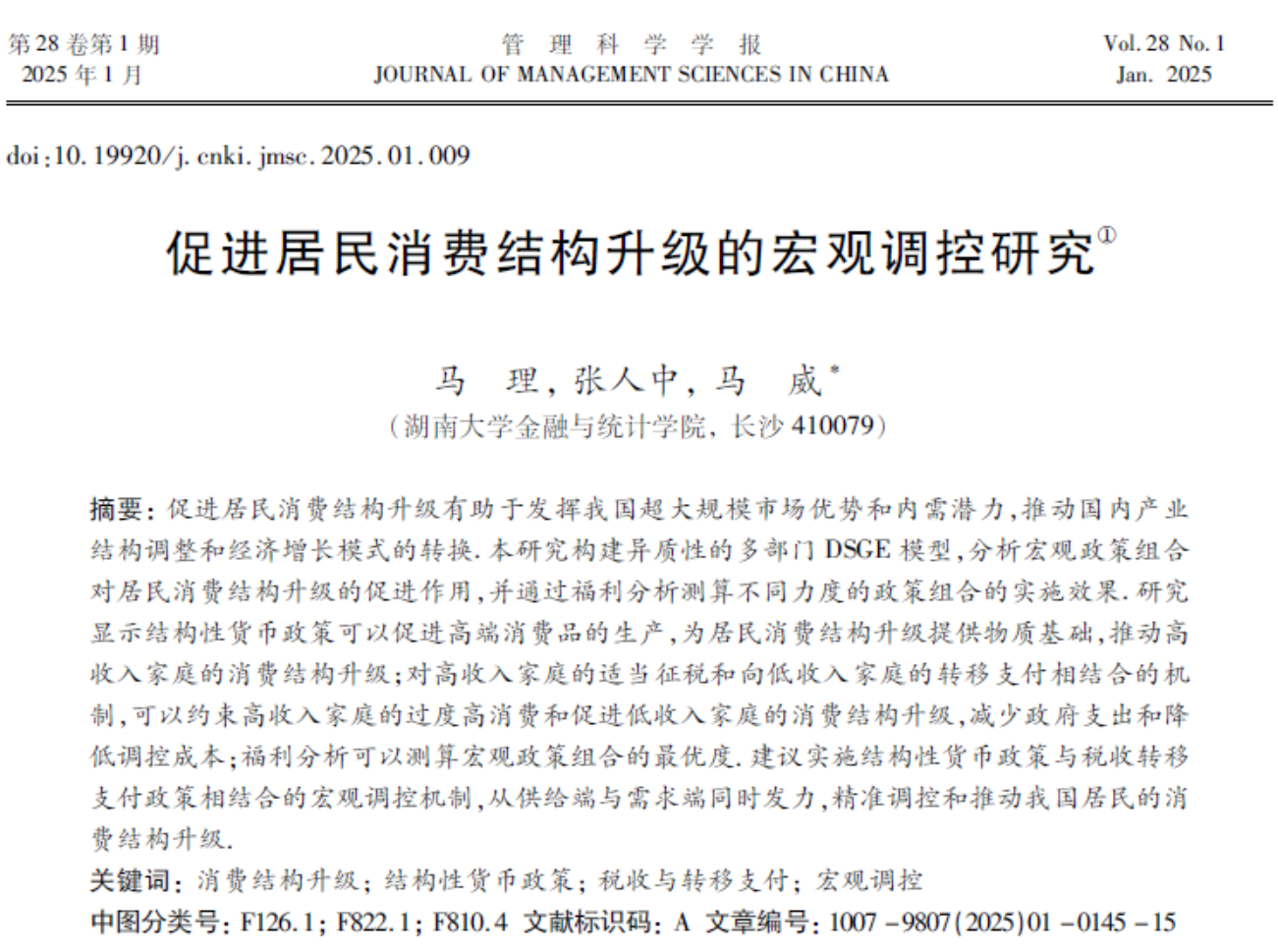 近日,365英国上市公司在线马理教授与2021级博士研究生张人中、马威教授合作的题为“促进居民消费结构升级的宏观调控研究”的论文发表在《管理科学学报》2025年第1期。