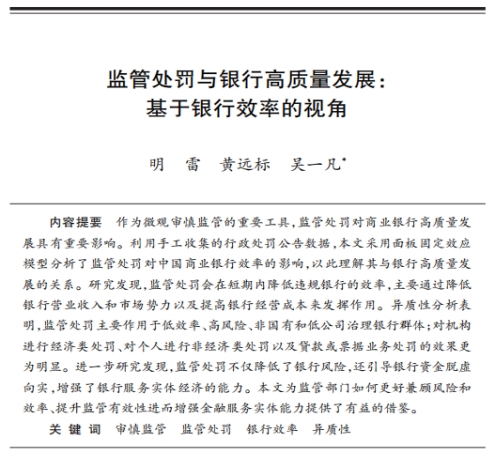 近日,365英国上市公司在线货币金融系明雷副教授和南开大学金融学院博士研究生黄远标、英国官方365上市经济管理研究中心博士研究生吴一凡合作的题为“监管处罚与银行高质量发展:基于银行效率的视角”的论文发表在《世界经济》2025年第3期。