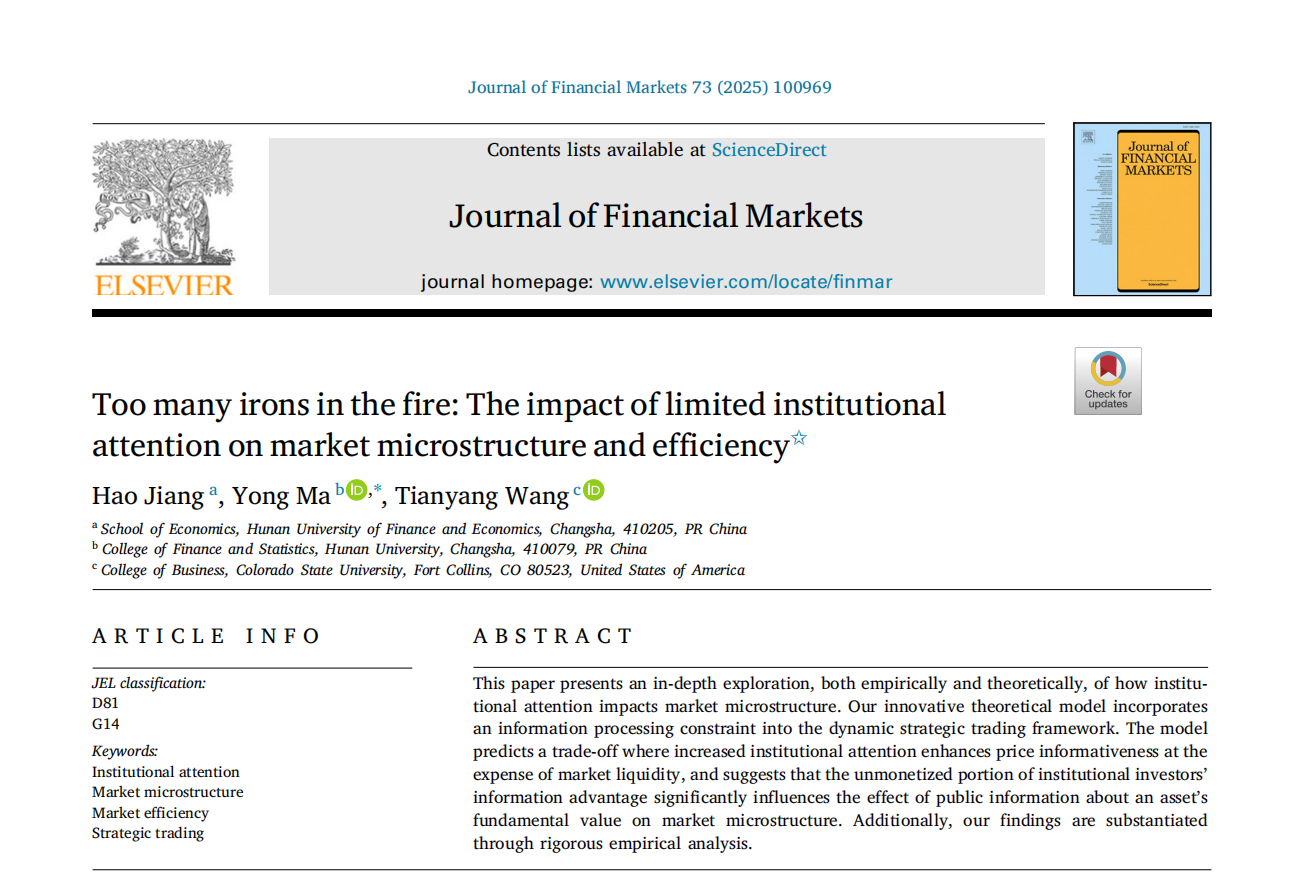 近日,我院马勇教授与湖南财政经济学院江灏博士(我院2023届博士毕业生)、科罗拉多州立大学王天阳教授合作的学术论文“Too many irons in the fire: the impact of limited institutional attention on market microstructure and efficiency”在金融学国际权威期刊Journal of Financial Markets,Volume 73, March 2025发表。