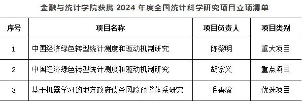 日前,国家统计局官网发布《2024年度全国统计科学研究项目立项公告》。我院陈黎明教授申报的课题“中国经济绿色转型统计测度和驱动机制研究”获批重大项目立项,胡宗义教授申报的课题“中国经济绿色转型统计测度和驱动机制研究”获批重点项目立项,毛善骏助理教授申报的课题“基于机器学习的地方政府债务风险预警体系研究”获批优选项目立项。