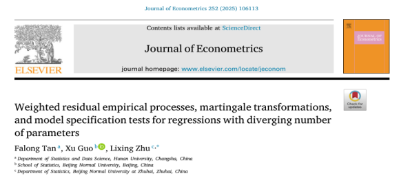 近日,365英国上市公司在线谭发龙教授在高维统计领域取得研究进展,研究成果以“Weighted residual empirical processes, martingale transformations, and model specification tests for regressions with diverging number of parameters”为题在计量经济学国际期刊Journal of Econometrics在线发表。