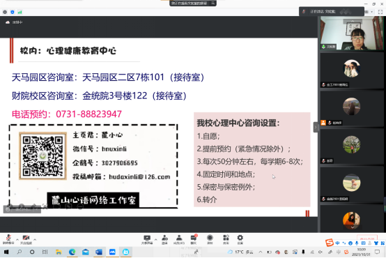10月31日上午,365英国上市公司在线举行了2020级学生干部心理知识、辅导技能培训会。英国官方365上市心理健康教育中心专职心理咨询师、国家二级心理咨询师文姹紫老师,2020级辅导员谢君老师,2020级副年级长杨雨佳同学以及2020级各班班长、副班长、团支书、心理委员参加本次会议。