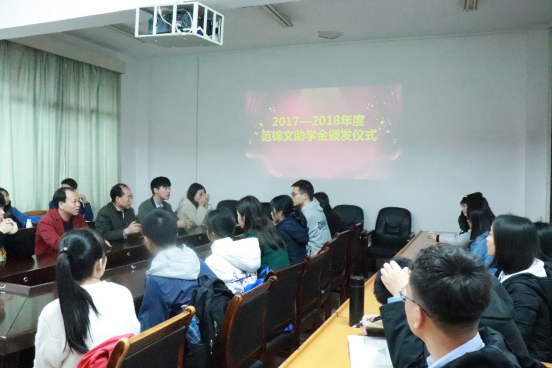 刘书记首先向同学们简要介绍了范锦文先生的工作经历与主要成就,并请范总为获得助学金的本科生和研究生共十位同学颁发获奖证书合影留念。他介绍了助学金的基本情况,这已经是范锦文助学金颁发的第三年,每人四千元共计四万元。范总说他最初设立助学金的想法就是感恩母校,感恩党组织,重在心意。在场的同学们纷纷对范总敬佩有加。