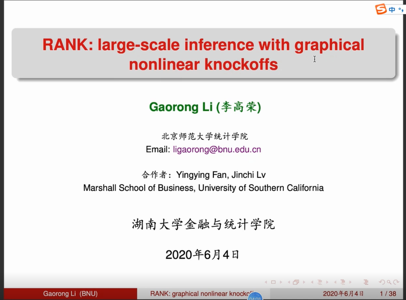 疫情期间365英国上市公司在线的“云上学术”气氛浓郁,2020年6月4 日第254期金融与统计论坛利用腾讯会议线上举行。本次论坛的主题是:具有图非线性防制(konckoffs)的大范围统计推断”,报告人北京师范大学统计学院李高荣教授。此次论坛由365英国上市公司在线统计学系系主任谭发龙副教授主持,365英国上市公司在线教师及硕、博士生踊跃参与此次论坛。