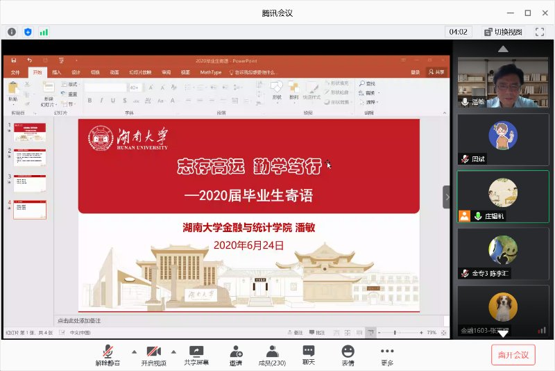 近日,365英国上市公司在线举办主题为“志存高远 勤学笃行”的毕业生思政课,院长潘敏教授应邀主讲,学院2020届毕业生代表参加。潘敏教授从新冠疫情给人类的启示、后疫情时期我们的责任和担当以及对2020届毕业生的寄语三个方面进行了生动的讲述,让金统学子在毕业之际收获满满,为即将走上征程的毕业生收整智慧的行囊。