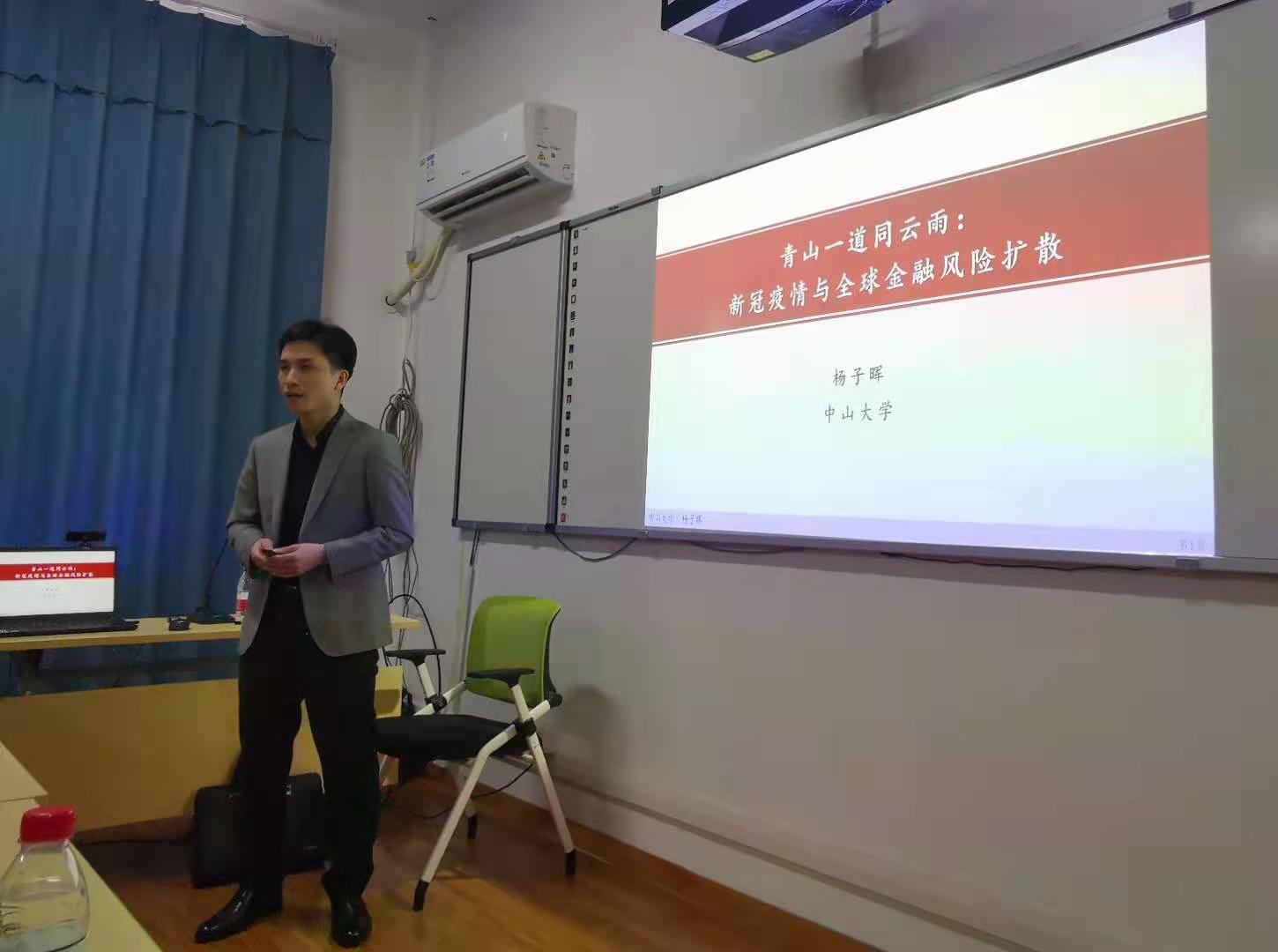 2021年3月26日下午,中山大学岭南学院杨子晖教授应邀来访我院,并做题为“青山一道同云雨:新冠疫情与全球金融风险扩散”的学术讲座。讲座由我院马理教授主持,喻旭兰教授、梁巨方副教授、明雷副教授、赵静助理教授、赵丽娟助理教授、岳崴助理教授,以及部分博士生和硕士生参加了此次讲座,现场座无虚席,讲座受到了同学们的热烈关注与积极响应。