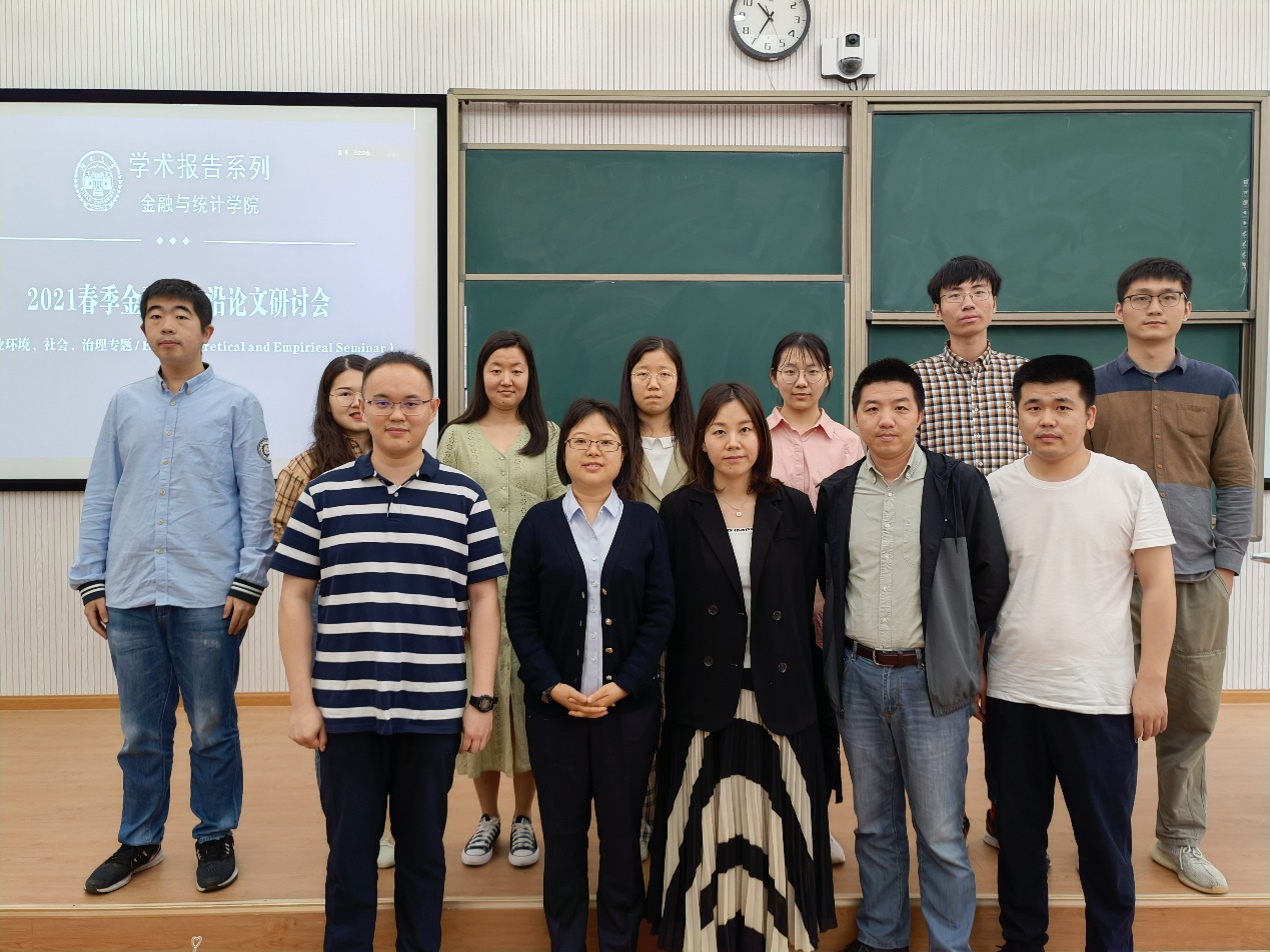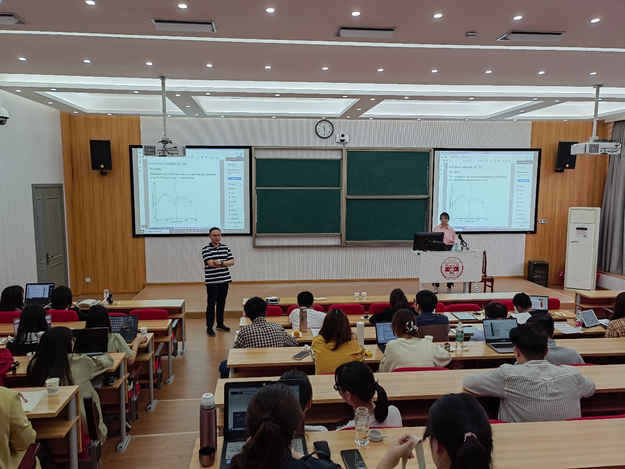 接下来,进入论文报告和研讨阶段,我院博士生和硕士生共计进行了七场汇报。上午,廖存非作题为《Hedging Climate Change News》的论文报告,此文提出了一种对冲气候变化风险的方法,通过新闻文本分析,测度气候变化风险新闻指数,证明该方法在样本内、外都能够对冲气候变化风险;姚彦铭报告的论文《Green Electricity Investment: Environmental Target and the Optimal Subsidy》对企业投资新能源电力的投资决策进行分析,基于此给出了政府为了达到给定环境目标而需制定的最优补贴政策;杨丹报告的论文题目为《Institutional Shareholders and Corporate Social Responsibility》,此文从“反向因果”的角度出发,量化机构投资者对公司的企业社会责任(CSR)评级的影响,从机构持股和股东关注度两个方面细致、全面地刻画了二者之间的影响效应。