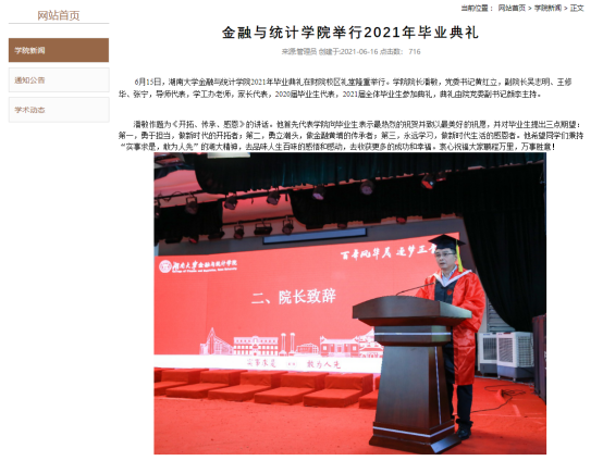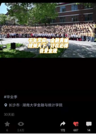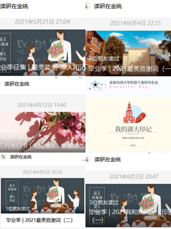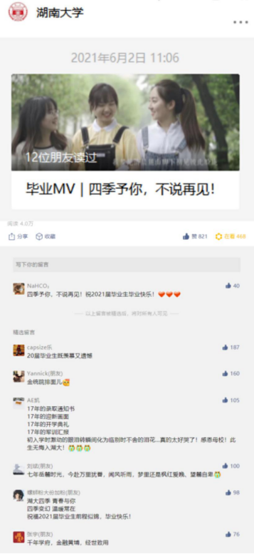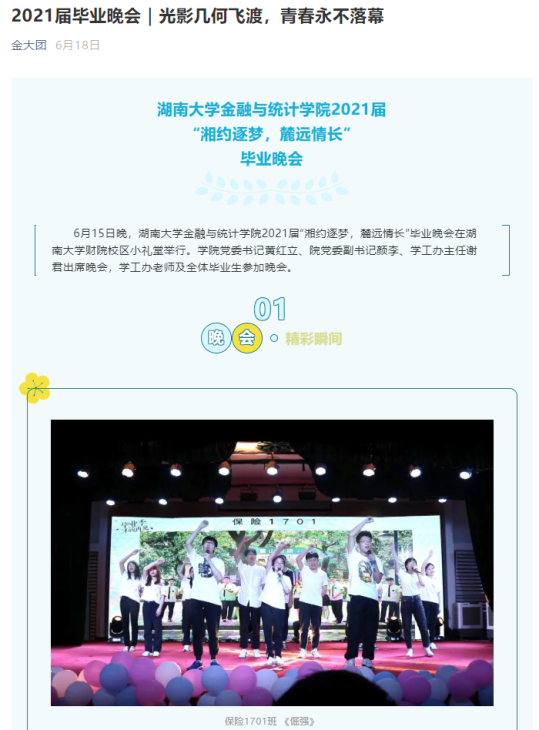 组织毕业生自主创作毕业题材歌曲、拍摄毕业照,举办毕业典礼和毕业晚会,引导毕业生知校、爱校、荣校。其中制作的毕业季MV湖大版《四季予你》被英国官方365上市官方微信公众号、哔哩哔哩、央视频等平台推出,获4万阅读量;毕业班辅导员利用毕业照拍摄过程的素材所制作的毕业季Vlog,获2.6万浏览量,营造了温馨阳光的毕业季氛围。