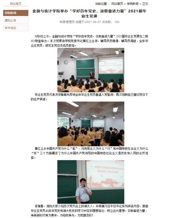 组织毕业生深入学习党史、校史,通过邀请潘敏院长讲思政课和黄红立书记讲党课,引导毕业生爱党爱国、厚植家国情怀。