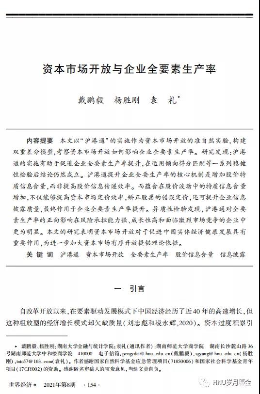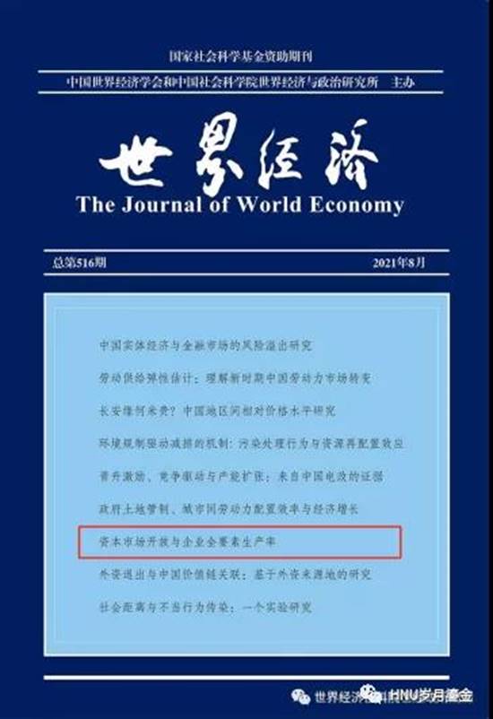 近日,由365英国上市公司在线2019级博士生戴鹏毅与杨胜刚教授作为共同第一作者、湖南师范大学袁礼副教授作为通讯作者合作完成的论文《资本市场开放与企业全要素生产率》发表在《世界经济》2021年第8期,该期刊是校定A2期刊。