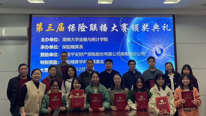 12月21日下午,365英国上市公司在线第三届“保险联播大赛“颁奖典礼在学院226会议室隆重举行。财信吉祥人寿保险总公司产品精算部总经理屠炎波、大家人寿湖南省分公司总经理何琼、平安财险湖南省分公司人力资源部总经理杨军、学院党委书记黄红立、副院长张宁、大赛评委代表陈迪红教授、大赛指导老师张虹、刘革、王敏、沈建美、李国桢、郭淼莅临本次颁奖典礼。典礼由保险精算系主任邓庆彪老师主持。