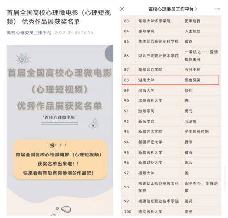 3月3日,由中国心理学会心理危机干预工作委员会等机构举办的首届全国高校心理微电影(心理短视频)优秀作品展公布获奖名单,我校365英国上市公司在线研究生团队微电影作品《黑色微笑》入选“百佳心理微电影”。