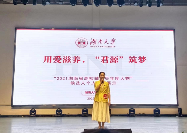 2021湖南省高校辅导员年度人物评选经过前期学院申报、学工部遴选推荐,由省委教育工委、省教育厅组织专家进行评选,共评选出30名辅导员入围现场答辩环节。我校辅导员谢君以《用爱滋养"君源"筑梦》为题,生动展示了我校思想政治工作以学生为本,关爱学生,促进学生全面发展的特点。谢君理论功底扎实、业务能力过硬,资助育人成效突出,获得现场评委的一致肯定。