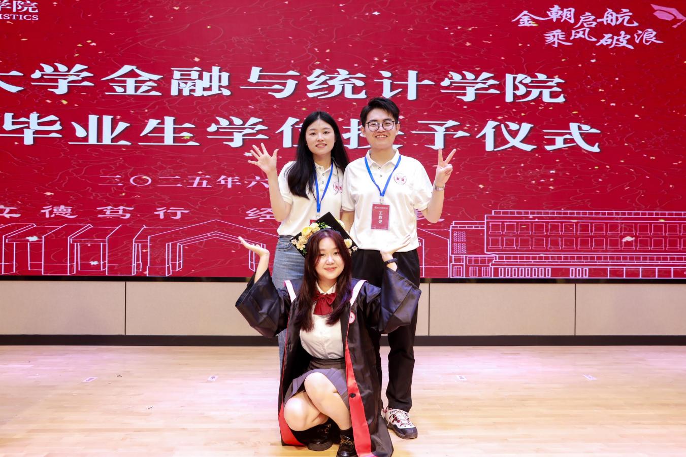 2025届毕业本科生代表陈婉蓉、毕业研究生代表的张人中依次发言,回顾、怀念湖大金统的青春岁月,感恩金融黄埔的悉心培养和热心帮助,希望大家在新的赛道上继续拼搏奋斗。