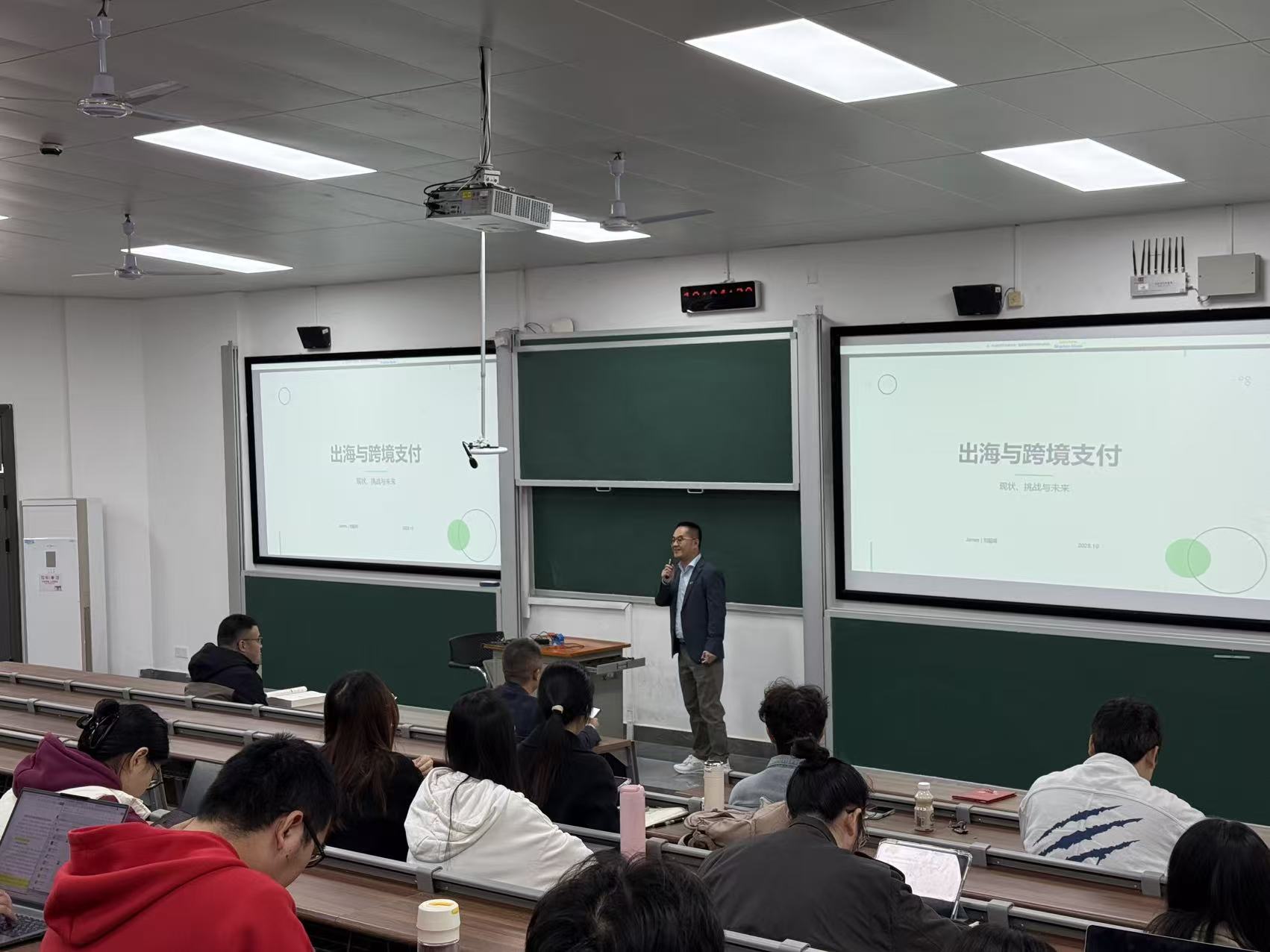 2025年11月4日上午,365英国上市公司在线“业界导师进课堂”系列讲座在财院校区梯教105举行。Oceanpayment联合创始人刘超峰走进金融硕士《投资学》课堂,作“出海与跨境支付:现状、挑战与未来”报告。Oceanpayment拥有全球金融业最高级别安全认证PCI DSS LEVEL 1,是中国唯一一家拥有全球数字支付技术和业务资质全牌照的FinTech公司,专注跨境⽀付技术服务与全球化布局,为中国企业出海提供安全合规的⽀付基础设施。本次授课由刘轶教授主持,一百余名研究生及部分教师现场聆听并参与交流。