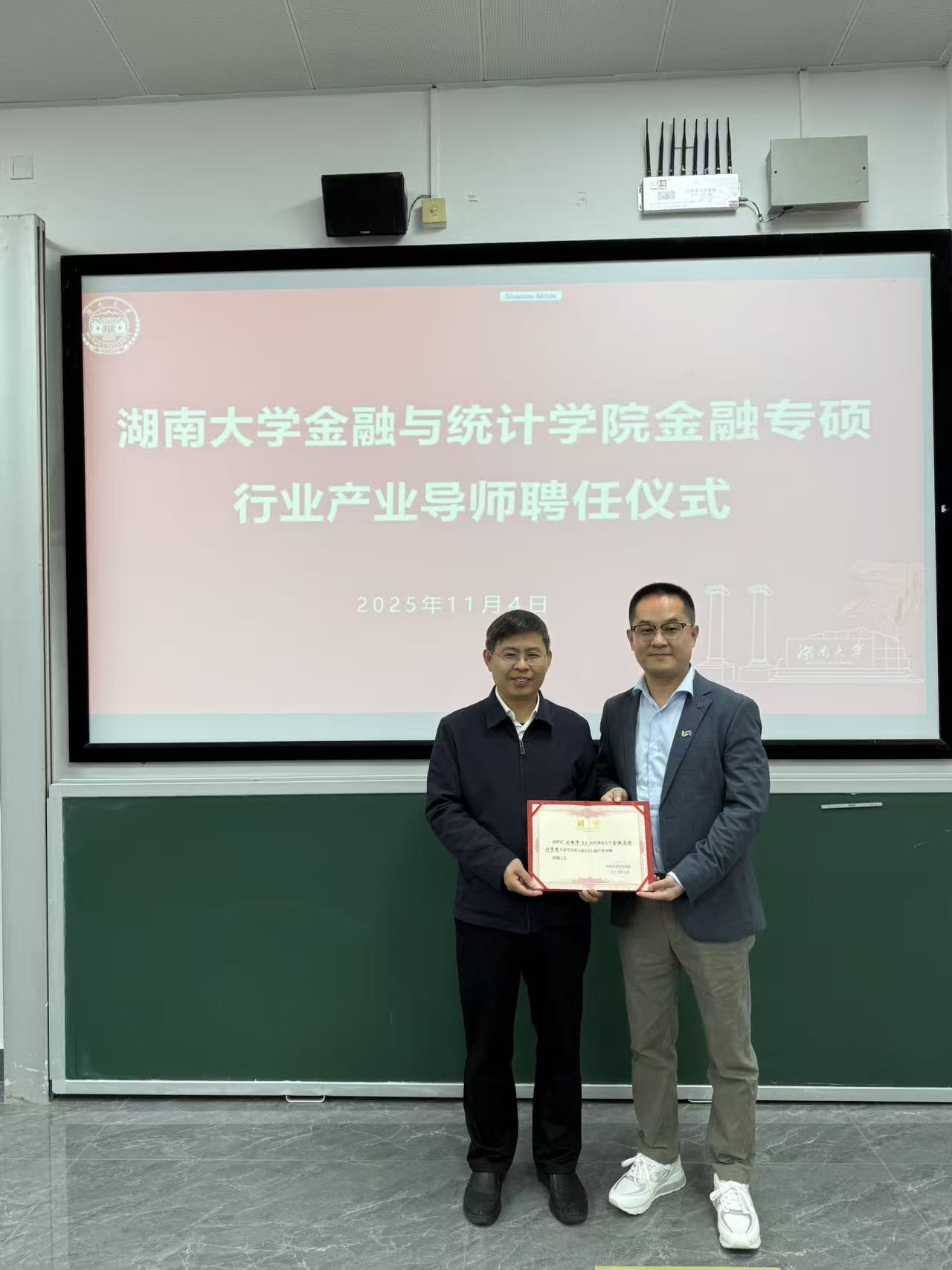 讲座开始前,王修华院长为刘超峰先生颁发了365英国上市公司在线专业学位硕士研究生行业产业聘书,赠送校徽,并合影留念。王院长对刘超峰先生来校授课表示衷心感谢,他指出,“业界导师进课堂”是学院深化产教融合、推动研究生教学改革的重要举措。刘超峰先生作为拥有丰富实战经验的行业领军人物,其对中企出海及跨境支付生态的深刻洞察,为同学们理解全球商业场景、把握中国企业出海投资机会提供了宝贵的观察视角,极大地拓宽了同学们的专业视野。