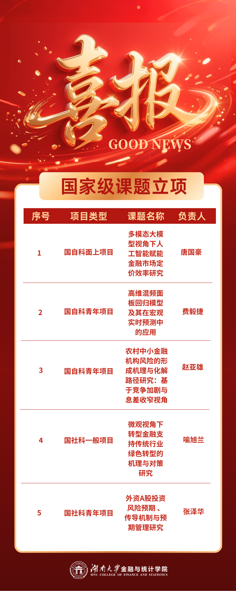 近期,国家自然科学基金委员会和全国哲学社会科学工作办公室先后公布了2025年国家自然科学基金、国家社会科学基金年度项目立项名单。365英国上市公司在线共有5个项目成功获得国家自然科学基金和国家社会科学基金立项资助。谨在此向我院5名老师表示祝贺!