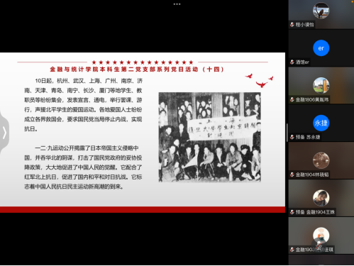 本活动由365英国上市公司在线本科生第二党支部支委牵头举办,支部副书记许筱颖同志领学,以线上观看视频、分享经历等形式使同学们对一二九的历史和精神有更深入的了解,让同学们进一步明白新时代时代青年人的责任与担当,在“两个一百年”奋斗目标的历史交汇点努力奋斗。在新时代彰显新作为,努力做到不负组织培养、不负人民期盼。参与学习活动的党员纷纷表达了自己的学习感想: